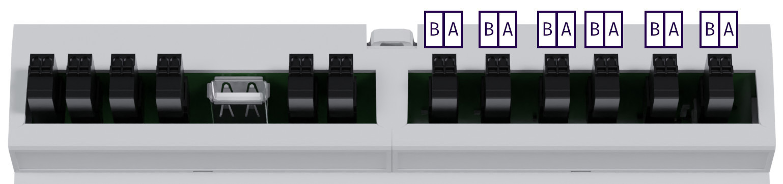 Verbinden Sie die Modbus-RTU-Schnittstelle des Zählers mit einer der freien RS485-Klemmen S1 bis S6 oben rechts am LADEgenius (siehe Abbildungen).